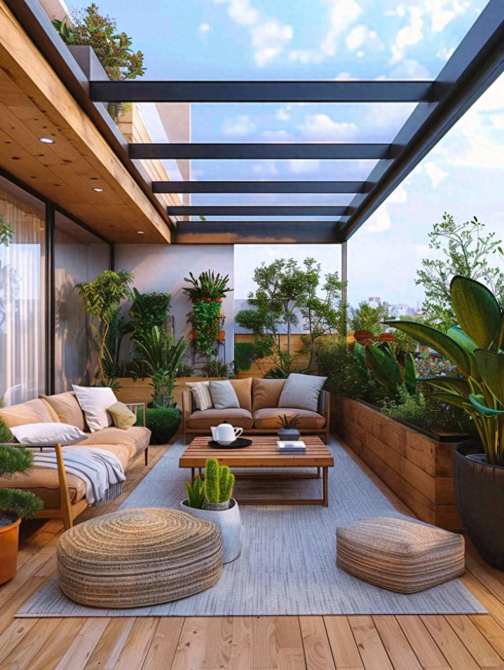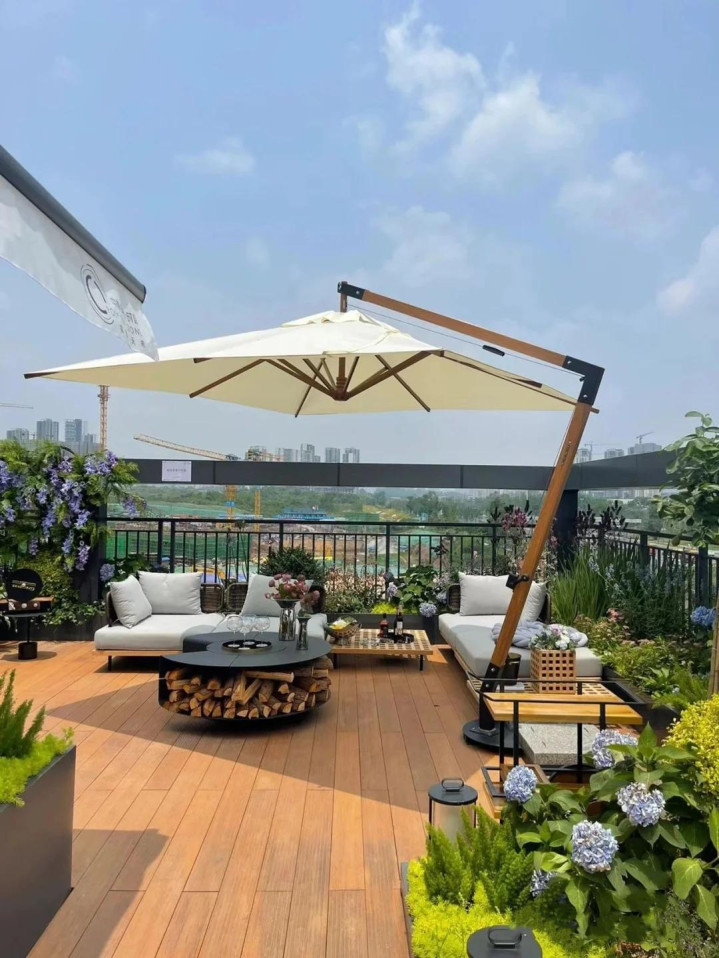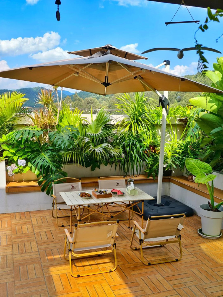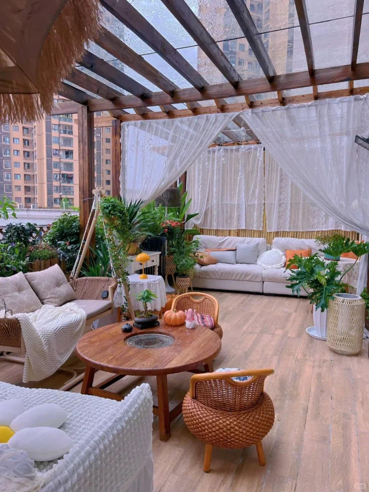 如果预算够,甚至可以装个可伸缩的雨棚,晴天遮阳,雨天挡雨,四季都能用。